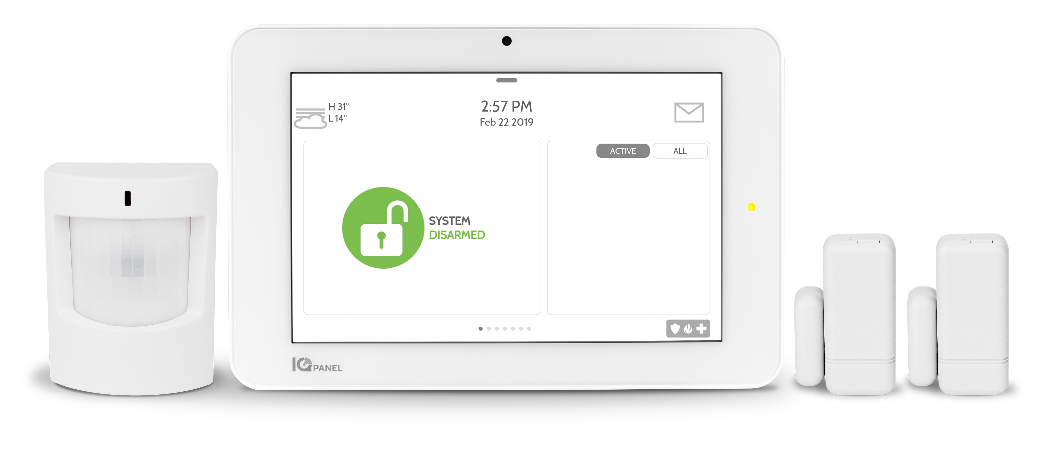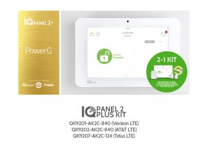 The IQ Panel 2 Plus kit includes the IQ Panel 2 Plus with PowerG and 319.5 MHz radio, 2 S-Line Encrypted 319.5 MHz Mini door/window sensors, and an S-Line Encrypted 319.5 MHz Motion sensor.